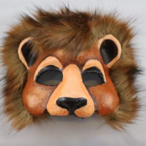 Handmade out of recyclable materials, papier mache, and faux fur with meticulous handpainting, lined on the inside, and elastic back.
