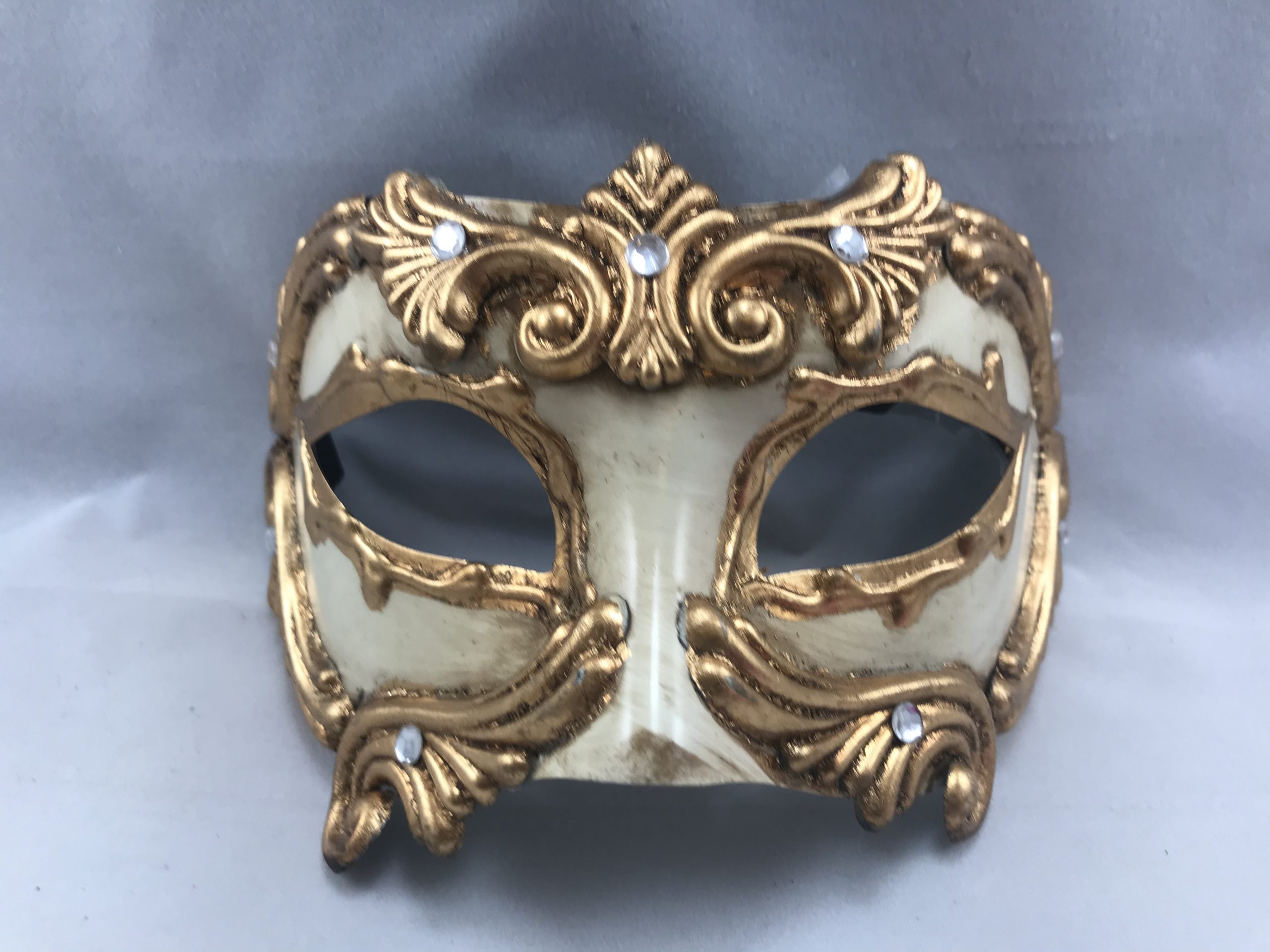 This Souvenir Mask, the Gold Columbina is painted and decorated with rhinestones.