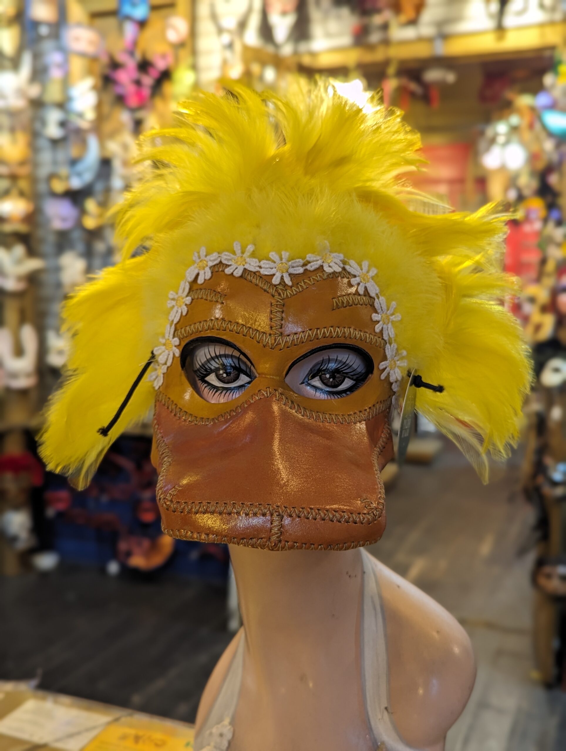 Stitched leather with daisy trim and yellow feathers. Elastic pull tie