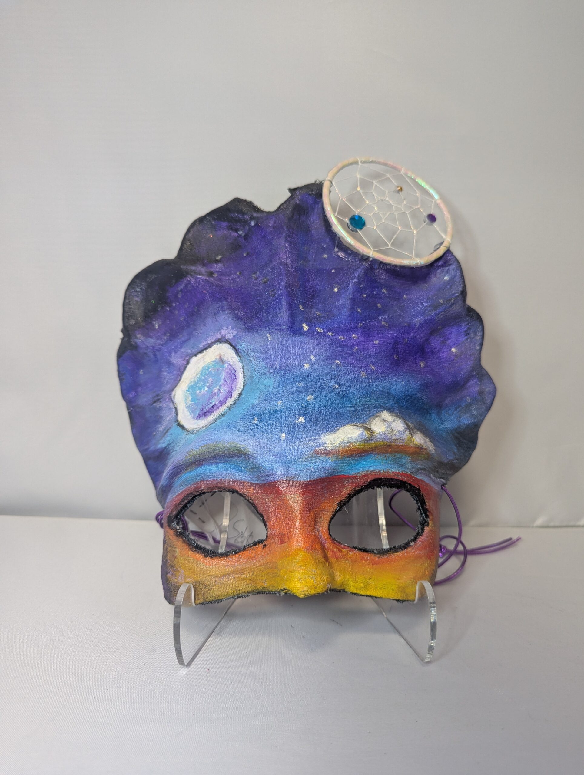 Handpainted paper mache with attached dreamcatcher and jewels . Velvet backing and elastic band