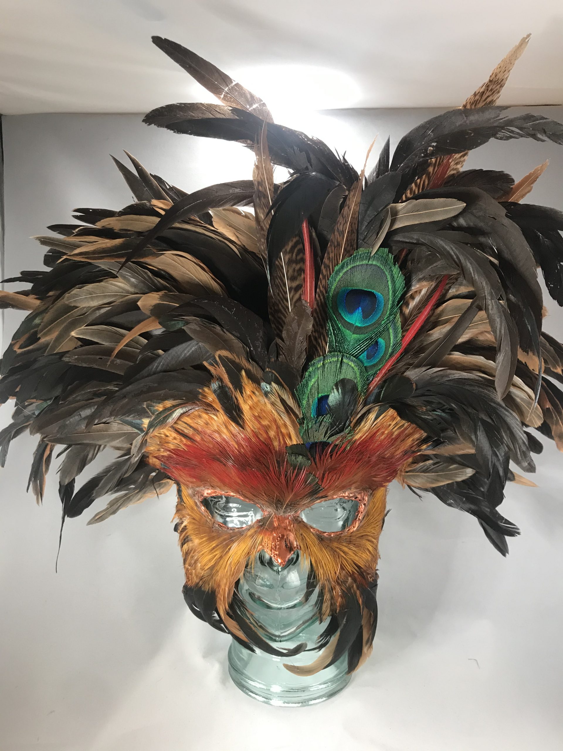 Paper mache with Ostrich feather. Velvet lining and elastic band