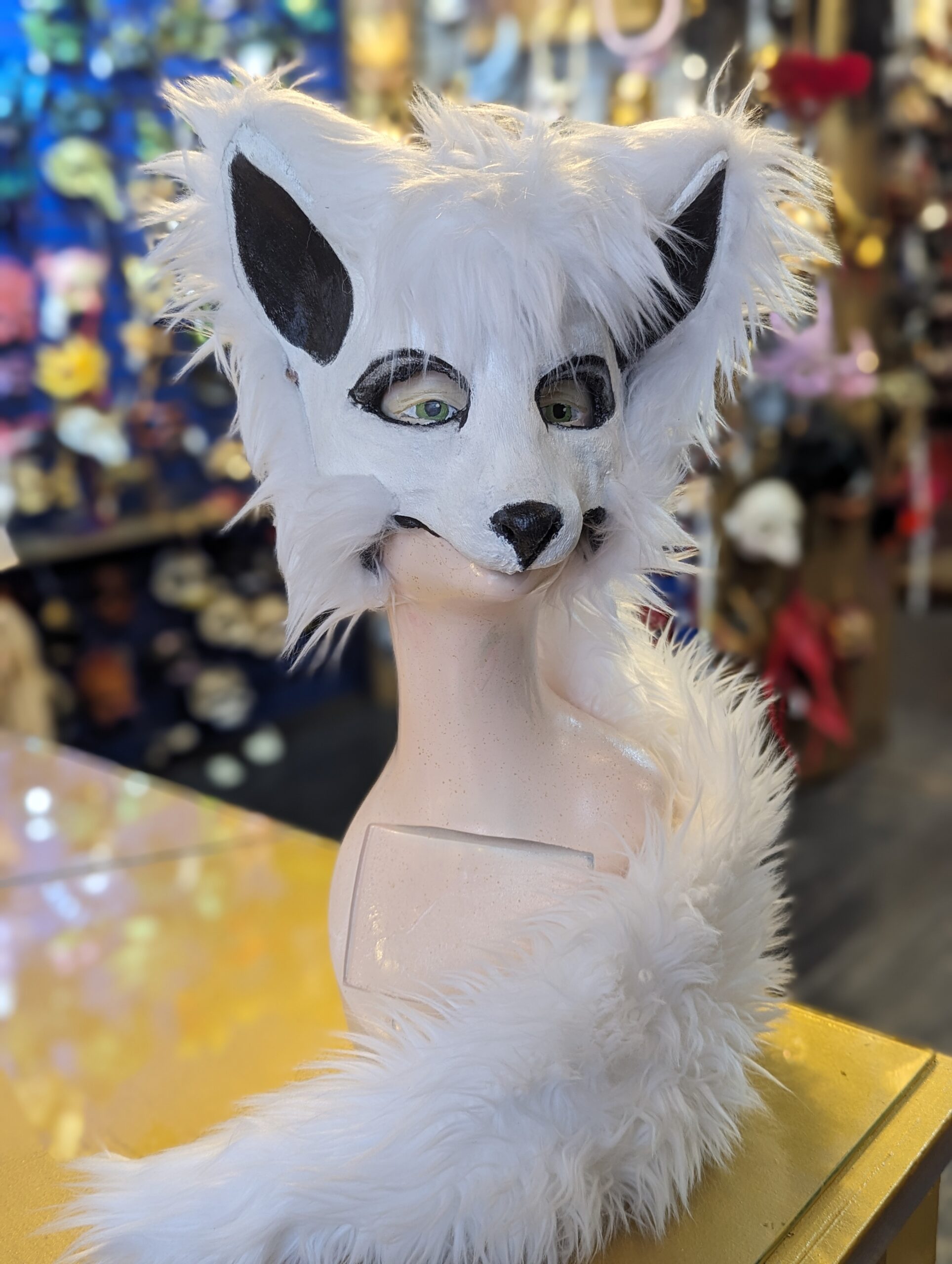 Paper mache with faux fur. Elastic band with attached tail. Lightweight and comfortable