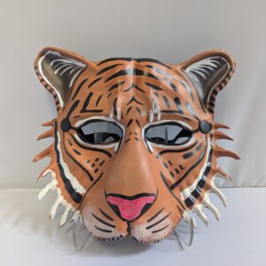 Papier Mache White Tiger Mask is painted and accented with faux fur. Mask is lined for comfort.