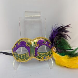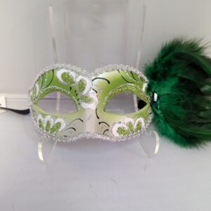 Mask is painted green green glitter, black trim and black tall feathers with green rose on one side.